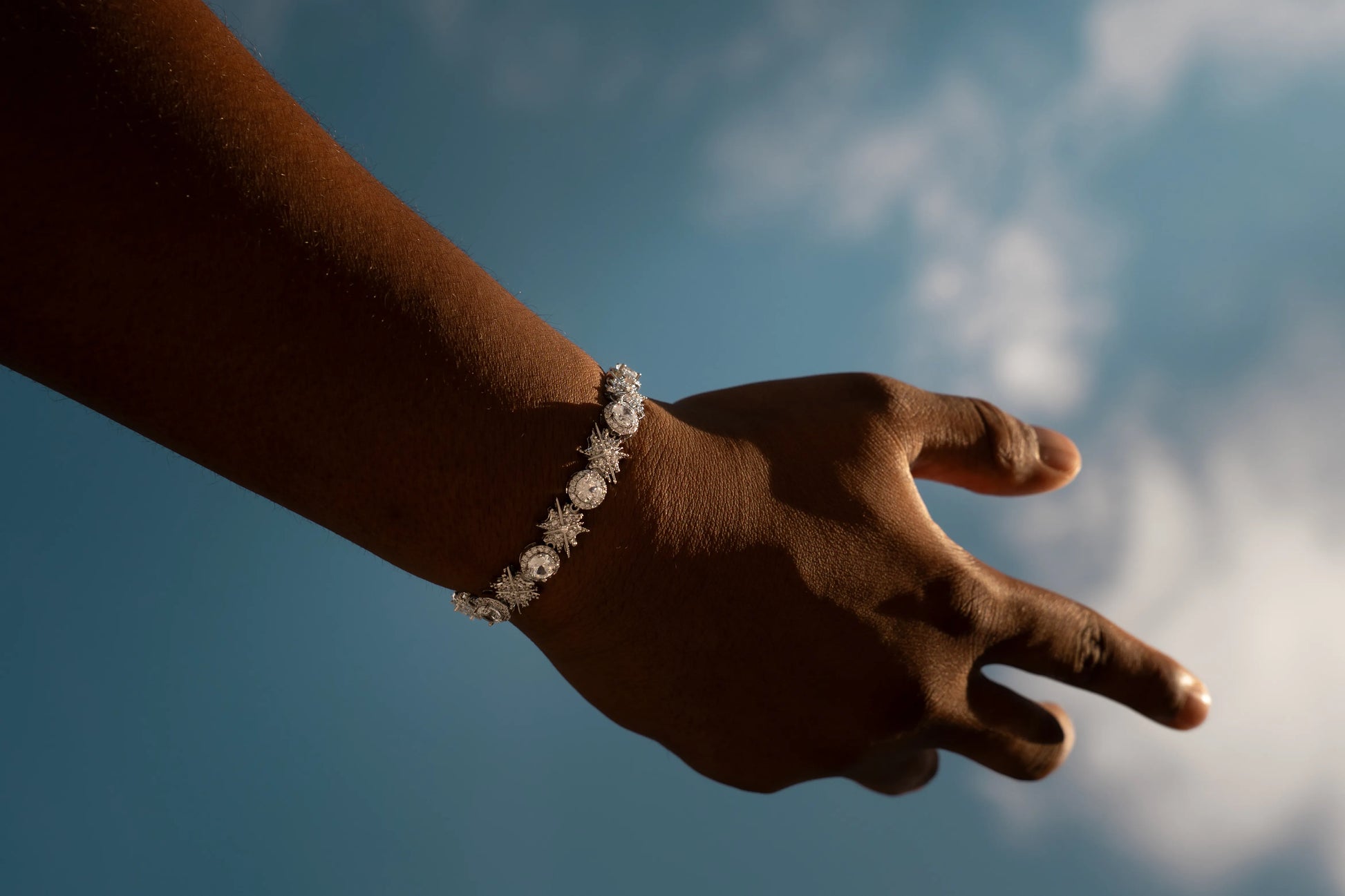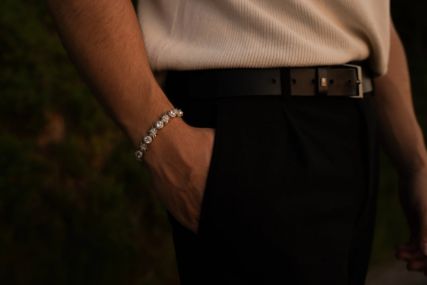A bracelet combining circles and stars to frame your wrist with structure and subtle originality. A distinctive piece designed to elevate your everyday style.
